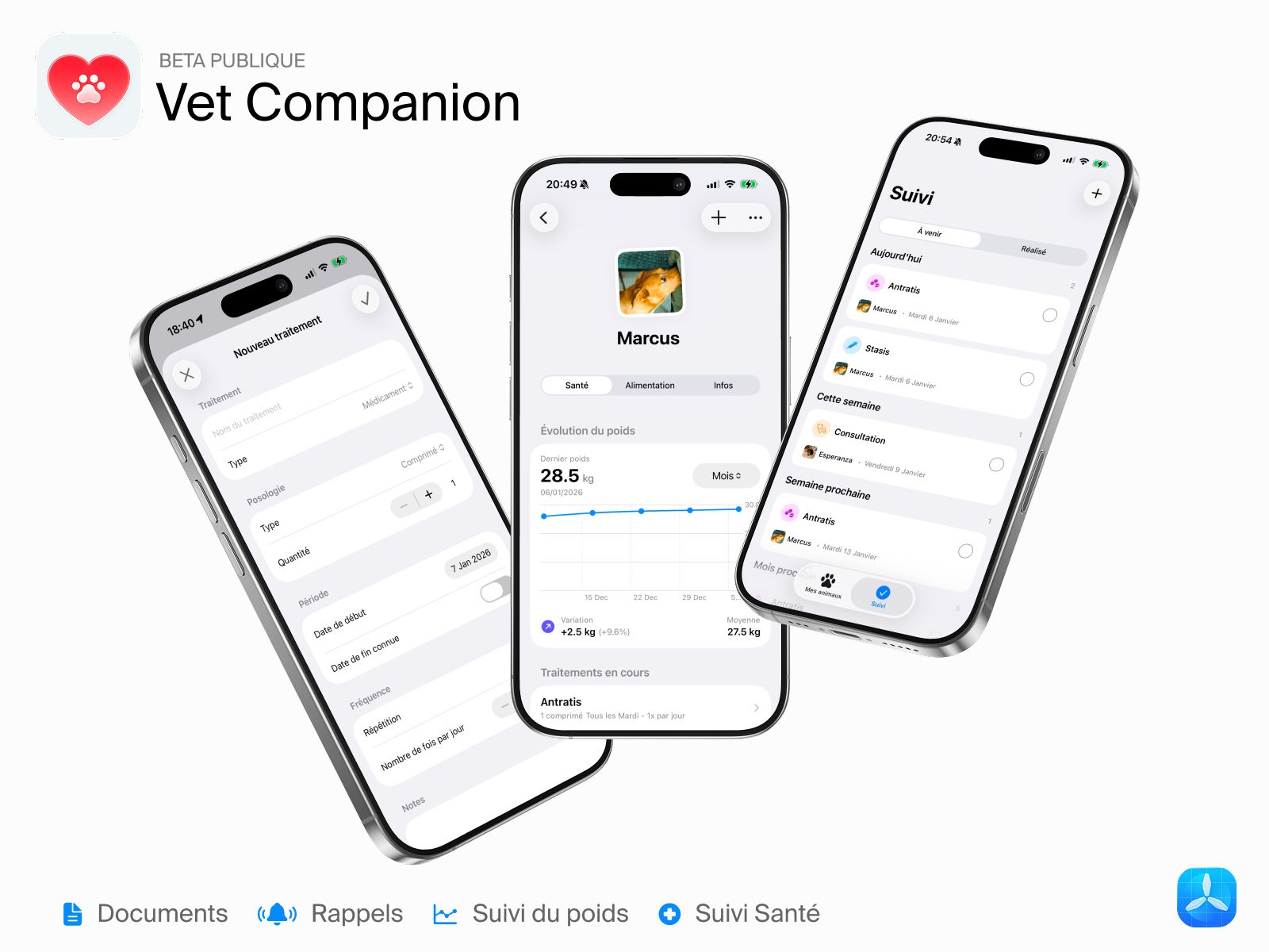 Le projet : Un carnet de santé sur iOS (app native) pour centraliser le suivi médical (poids, vaccins, traitements) des chiens et des chats.